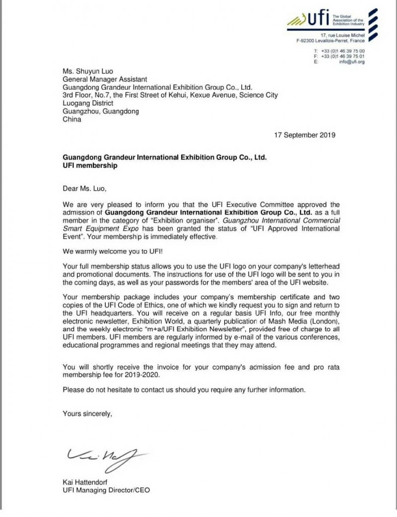 “UFI经常在不同国家举办各种针对性的培训和交流活动。通过UFI认证以后,我们可以参加UFI举办的各项活动,增加学习机会,加强国际交流,提高广州商博会的办展水平。”张彦中总监表示,展会的国际化程度与影响力将大大提升,专业化和规范化程度上要求将会更高,对我们展会的策划运作要求也将更高。