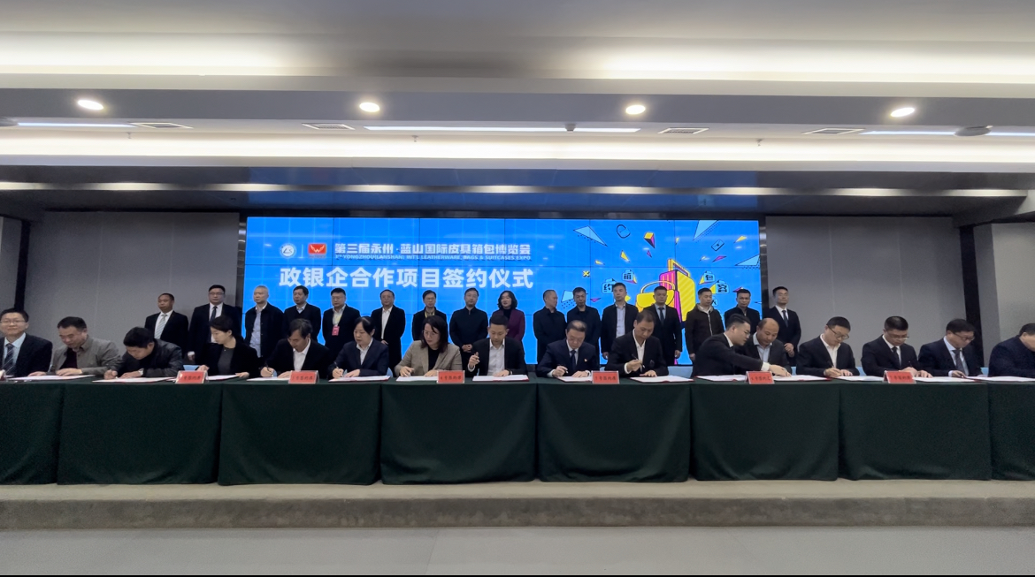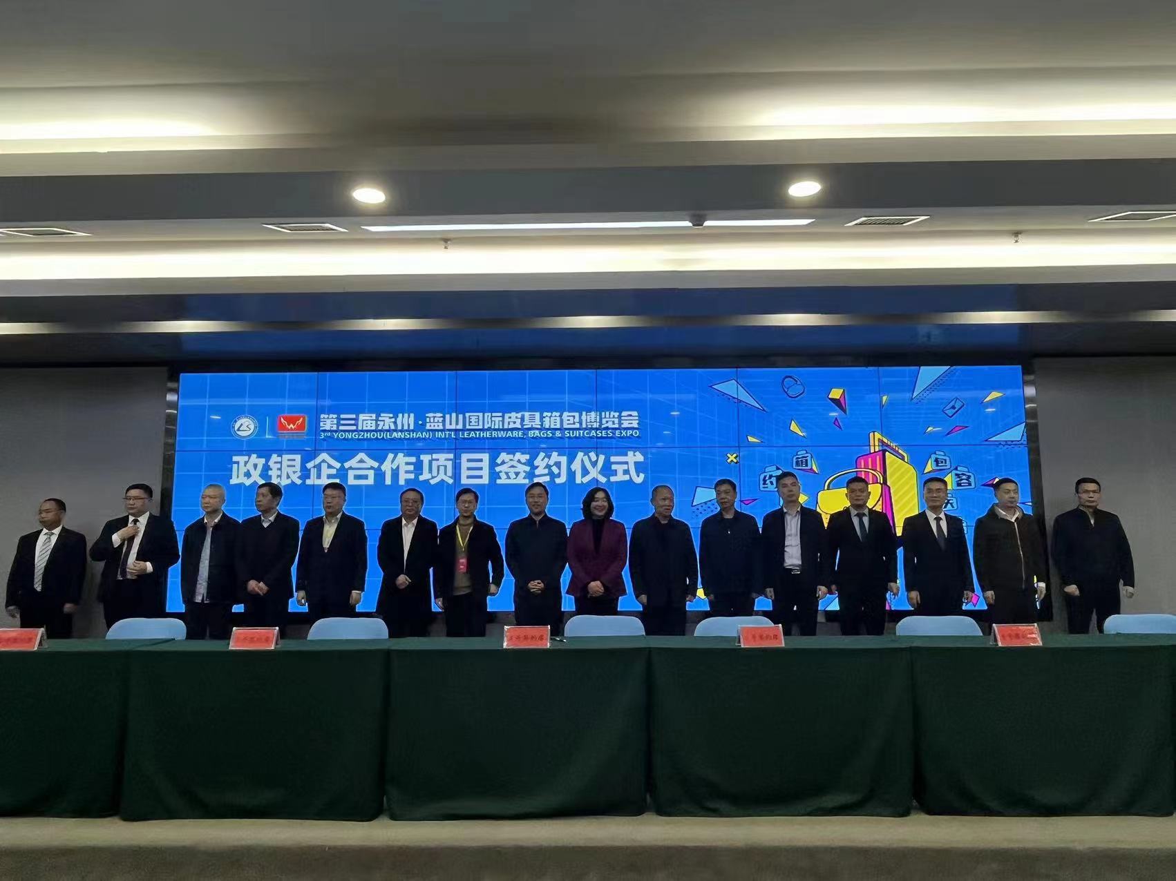 3月24日上午,第三届永州·蓝山国际皮具箱包博览会开幕后,蓝山县举行政银企合作项目签约仪式。永州市政府副秘书长肖潇、永州市人民银行中心支行行长王一凡、永州市银保监分局二级调研员李树屏、永州市优化办主任文贻荣、永州市各银行机构主要负责人以及蓝山县委副书记、县长邓群,县委常委、常务副县长张国材,副县长刘建军等领导参加了仪式。