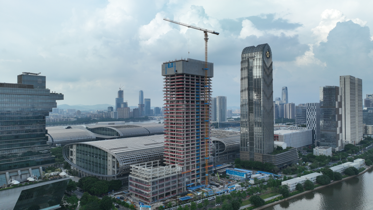 6月9日,广交会展馆四期项目指挥中心主体结构顺利封顶。指挥中心是四期项目中“海拔”最高的建筑,由1栋171.9米高的塔楼和4层裙楼组成,集会议功能与日常办公于一体。目前,指挥中心幕墙工程已展开安装,预计今年12月底完成建设工作。